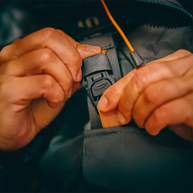 På brystet er det en romslig frontlomme og en fleecefôret håndvarmerlomme på innsiden. En Tool Bar™ for å feste verktøy og på innsiden en flipp-over hengelomme. Vær oppmerksom på at lommene ikke er helt vanntette, og du må ikke oppbevare mobiltelefon, bilnøkler eller annet elektrisk utstyr her.