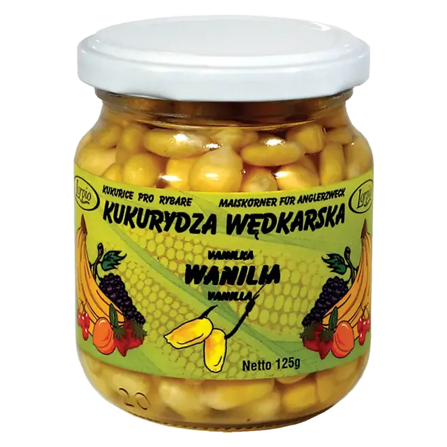 Lorpio Corn Flavoured In Juice 125 g Vanilla. Maiskorn i lake med forskjellige smaker til krokagn. Hele maiskjernen er med og sørger for at agnet ditt sitter godt fast på kroken og lukter ekstra godt!