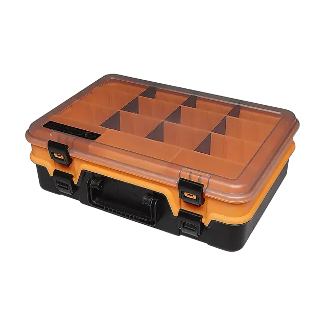 Tackle box med gjennomsiktig gråfarget lokk, PP-materiale med UV-beskyttelse. Rommer det meste du trenger å ha i enden av snøret på fisketurene dine.